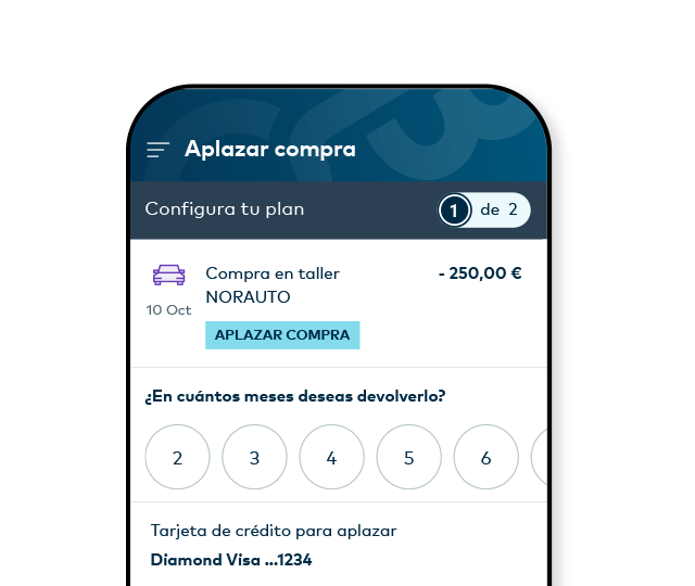 Puedes aplazar tus compras y pagos iguales o superiores a 30 € a 1 mes sin intereses (0 % TAE1 y TIN anual) o fraccionarlos en varios plazos, entre 2 y 36 meses (10 % TAE2 y 9,57 % TIN anual).